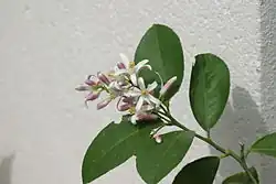 Oboupohlavné, obvykle pětičetné, asi 2 cm velké, vonící, v poupěti narůžovělé květy vyrůstají jednotlivě nebo ve svazečcíchúžlabí listů nebo na koncích větví. Kališní lístky jsou srostlé, korunní jsou volné, podlouhlé, asi 17 × 5 mm velké, zevnitř bílé a zvenčí narůžovělé. V květu bývá 20 až 40 tyčinek se žlutými prašníky. Květy s podlouhlým semeníkem jsou opylovány létajícícm hmyzem.