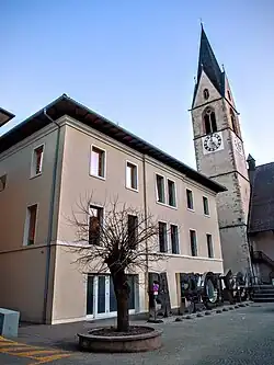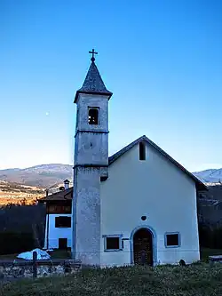 ![]() Zvonice kostela a střechy v centru obce Cles | |