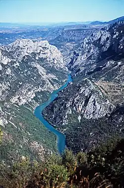Vyhlídka leží nad výstupem řeky Verdon ze soutěsky Gorges du Verdon a nabízí nerušené výhledy na řeku Verdon ležící v hloubce 300 m pod ní a na začátek přehradního jezera Lac de Sainte-Croix a most Galetas. V pozadí jezera Sainte-Croix se horizont modravě prolíná s levandulovými poli na náhorní plošině Plateau de Valensole. [1]