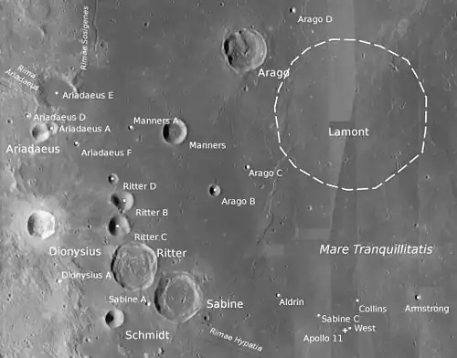 Než Mezinárodní astronomická unie přejmenovala kráter Collins na současný název, měl označení Sabine D.[1] Poblíž dopadla americká vesmírná sonda Ranger 8 (1965) a přistála sonda Surveyor 5 (1967).[1]