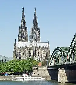 - Dóm čili katedrála svatého Petra, pětilodní gotická bazilika s ochozem, kaplí a dvěma věžemi, je 144 m dlouhá a výška klenby činí 43,3 m. Západní část s věžemi byla postavena až v 19. století. Z vnitřního zařízení vyniká relikviář Tří králů ze 13. století, středověké vitráže v oknech a mohutné historické zvony. Katedrálu navštěvuje asi 6 milionů návštěvníků ročně a je součástí Světového dědictví UNESCO.