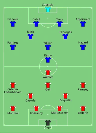 Chelsea nastoupila v předpokládaném rozestavení 4-2-3-1 s ofenzivními záložníky Willianem a Edenem Hazardem, kteří měli za úkol podporovat osamoceného útočníka Loïca Rémyho, jenž v základní sestavě nahradil zraněného Diega Costu. Střed zálohy tvořilo duo Francesc Fàbregas a Nemanja Matić. Na postu stoperů nastoupili kapitán John Terry a Gary Cahill, jehož start byl podle manažerových slov nejistý.[10][11] Arsenal v utkání zvolil stejné rozestavení jako Chelsea. Na hrotu operoval osamocený Theo Walcott, jenž byl ze zálohy podporován Mesutem Özilem hrajícím na pozici tvůrce hry.[12] V předpokládané sestavě chyběl záložník Jack Wilshere, který si během tréninku poranil kotník.[13] V nominaci rovněž absentoval nejlepší střelec předchozí sezony Alexis Sánchez, jenž měl kvůli reprezentačním povinnostem na Copa América prodlouženou dovolenou.[14] Svůj debut v dresu Arsenalu si odbyl brankář Petr Čech, který do svého nového působiště zamířil před sezonou právě z Chelsea.[11][15]