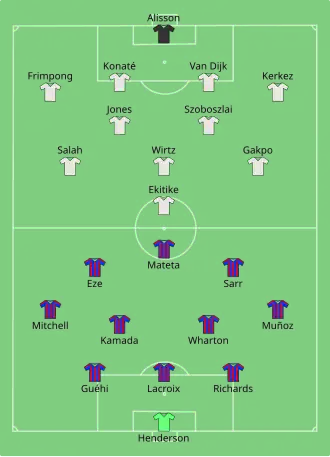 Liverpool se ujal vedení hned ve 4. minutě, kdy skóroval Hugo Ekitiké. V 17. minutě ale Jean-Philippe Mateta z Crystal Palace vyrovnal z penalty, kterou rozhodčí nařídil po faulu Virgila van Dijka. Jeremie Frimpong obnovil vedení Liverpoolu, když skóroval ve 21. minutě, ale Crystal Palace v 77. minutě zase srovnalo po gólu Ismaïly Sarra.
