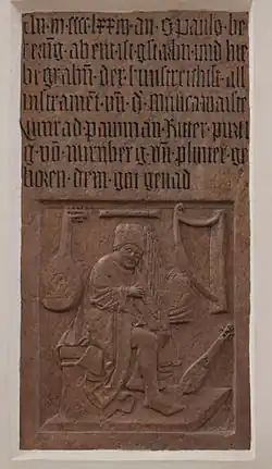 | „ | Roku 1473, na obrácení sv. Pavla zemřel a zde byl pohřben vynikající mistr všech hudebních nástrojů a hudby, Cunrad Pawman, rytíř, narozen jako slepý v Norimberku. Smiluj se nad ním, Bože.[1] (An[no] MCCCCLXXIII an S. Pauls bekerung ist gestarbn und hie begraben der kunstreichist aller instrument und der musica maister Cunrad Pawman, Ritter, purtig von nurnberg und plinter geboren, dem got genad.) | “ |