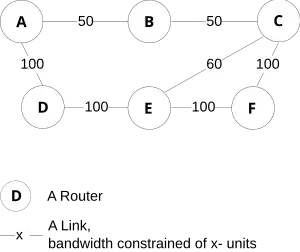 Uvažujme síť vpravo, v které má být spočítána cesta z routeru A na router C splňující omezení na šířka pásma, a kde cena každého spoje je rovna počtu hopů (tj. 1).