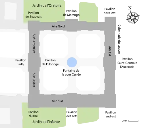 - na západě: pavillon du Roi, pavillon Sully (bývalý pavillon de l’Horloge), přičemž křídla pavillonu Sully mají vlastní označení: