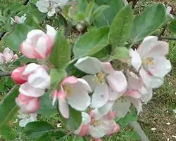 Počet květů se pohybuje mezi čtyřmi a devíti se střední hodnotou šest. Květenství je malý ve srovnání s jinými jabloněmi. Jednotlivé květy jsou složeny z pěti středně velkých okvětních lístků. Jsou dlouhé, střední velikosti, kulaté nebo dlouhé oválné.[3]