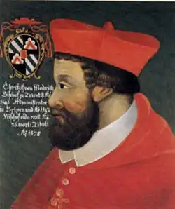 Kardinál Madruzzo se svým oficiálním erbem (malba ze 16. století)