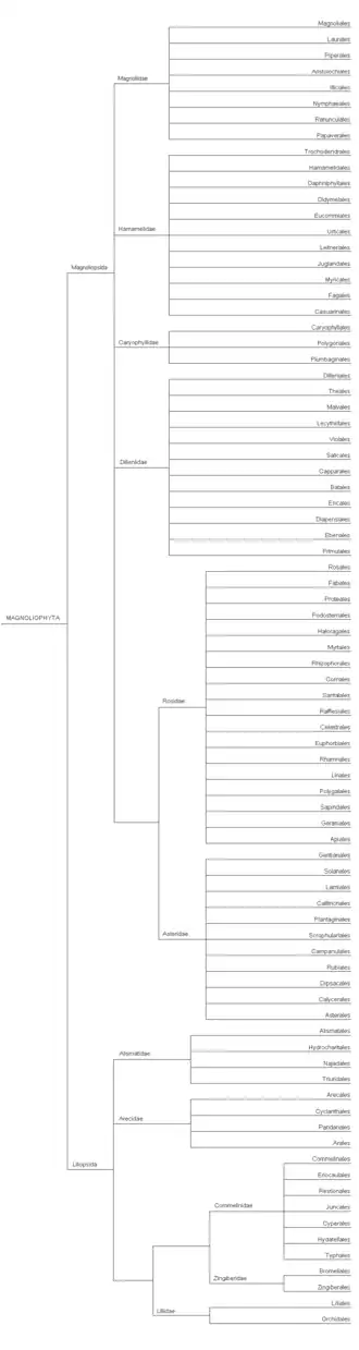 Cronquistův systém dělí kvetoucí rostliny do dvou široce pojatých tříd: Magnoliopsida (dvouděložné) and Liliopsida (jednoděložné). Příbuzné řády jsou v rámci jednotlivých tříd zařazovány do podtříd.