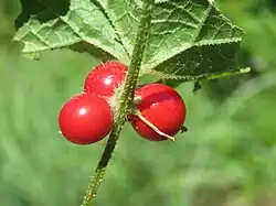 Plod je hladká, kulovitá, šťavnatá bobule o průměru asi 1 cm, která je zprvu zelená s podélnými bílými pruhy a chlupatá, později oranžová a ve zralosti jasně červená a lysá. Má krátkou stopku a obsahuje čtyři až osm žlutohnědých, podlouhle vejčitých semen asi 4 mm dlouhých a 2,5 mm širokých. Bývá součásti plodenství se dvěma až osmi květy v paždí listů. Zralé plody jsou lidmi poživatelné.[1][2][4][5][6][7][8][9]