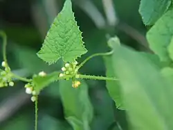 Květy jsou drobné, jednopohlavné, pětičetné, mají jasně žlutou barvu a na první pohled jsou samčí i samičí vzhledově stejné. Vyrůstají obvykle ve svazečcích z paždí listů. Samičí na krátkých stopkách v početnějších svazečcích, samičí jsou téměř přisedlé a objevují se jednotlivě nebo po třech, pěti až deseti. Květní lůžko bývá velké asi 1,5 mm, kalich je zvonkovitý, jeho zelené, šídlovité, chlupaté cípy tvoří asi 1 mm trubku. Koruna má žluté lístky velké asi 2 mm, podlouhlé a na vrcholu tupé. Samčí květ má tři volné tyčinky s podlouhlým prašníkem a rudimentální semeník. Samičí květ má spodní vejčitý semeník a čnělku s trojlaločnou bliznou.