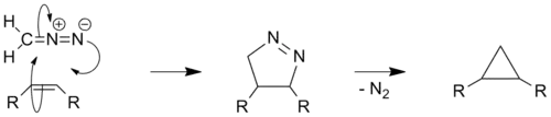 Některé diazosloučeniny, například diazomethan, mohou ve dvou krocích reagovat s alkeny za vzniku cyklopropanů. První krok spočívá v 1,3-dipolární cykloadici za tvorby pyrazolinů, jež jsou následně fotochemicky nebo tepelně denitrogenovány na cyklopropany. Tepelný rozklad, při kterém se často používají jako katalyzátory hydroxid draselný a platina, bývá rovněž označován jako Kishnerova syntéza cyklopropanů;[7] lze při něm také použít hydrazin a α,β-nenasycené karbonylové sloučeniny.[8]