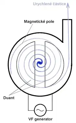 Částice se pohybují uvnitř dutých urychlovacích elektrod svou setrvačností a jejich dráha je zakřivována magnetickým polem, orientovaným kolmo na rovinu dráhy částic. Duté elektrody působí jako Faradayova klec a proto uvnitř nich neovlivňuje dráhu částic elektrické, ale pouze magnetické pole. Urychlování probíhá pouze v mezeře mezi duanty. Ty jsou napájeny vysokofrekvenčním střídavým proudem vhodné frekvence. Elektrické pole mezi duanty působí vždy takovým směrem, aby zvýšilo rychlost částic. Kinetická energie urychlené částice může po mnoha obězích dosáhnout hodnoty až 50 MeV.