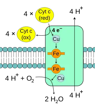 Na každý oxidovaný cytochrom c tedy dochází k zabudování jednoho protonu do molekuly vody a k přečerpání jednoho protonu z matrix do mezimembránového prostoru.[5] Ve skutečnosti je však mechanismus samozřejmě mnohem složitější, než se dá vystihnout pomocí chemické rovnice. V enzymu spolupracují různé proteinové podjednotky a prostetické skupiny, v rámci kterých dochází k transportu elektronů až na terminální akceptor, kyslík.