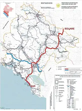 Černá Hora má aktuálně v provozu 41 km dálnice Bar - Bělehrad, která má spojit černohorské město a přístav Bar u Jaderského moře se Srbskem přes hraniční přechod Boljare. Odtud má navazovat srbská část dálnice až do Bělehradu (část označená jako dálnice A2 se již staví), čímž bude vytvořeno souvislé dálniční spojení střední Evropy s černohorským pobřežím.[1] Pro černohorské dálnice se počítá s nejvyšší dovolenou rychlostí 120 km/h.[2]