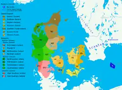 • jutská nářečí (jysk) – oblast Jutského poloostrova; dále se dělí na západní, východní a jižní;