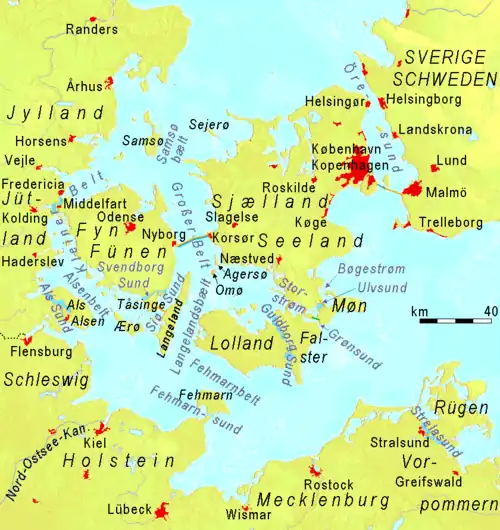 - jen dánské – Malý Belt, Velký Belt, Samsobelt, Alsenbelt, Als Sund, Svendborg Sund, Sio Sund, Langelandsbelt, Storstrom, Guldborg Sund, Gron Sund, Bogestrom, Ulv Sund