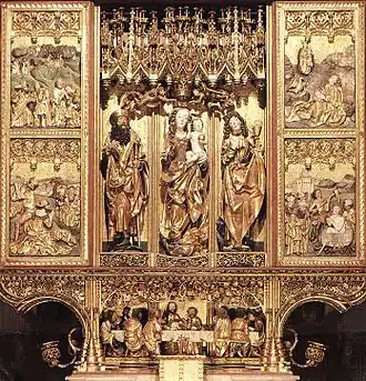 Má jednotnou výtvarnou koncepci ve spojení architektonické, sochařské a malířské složky. Vznikal za účasti více spoluautorů a dílenských spolupracovníků po etapách několik let (roku 1508 bylo pravděpodobně postaveno retabulum; deskové obrazy, sochy a reliéfy byly zhotoveny asi před rokem 1515 a celý oltář - polychromovaný a pozlacený - do roku 1517). V přepážce je skupina Poslední večeře, na zavřeném oltáři osm deskových obrazů Kristova umučení (Getsemanská zahrada a Jidášova zrada, Bičování, Korunování trním, výjev Hle člověk (Ecce homo), Kristus před Pilátovým soudem, Nesení kříže, Ukřižování a Zmrtvýchvstání). Malby jsou provedeny podle předloh Lucase Cranacha staršího a Hanse Leonharda Schäufeleina. Na vnitřních stranách pohyblivých křídel se nacházejí čtyři reliéfy - Rozeslání apoštolů, Stětí sv. Jakuba, Jan Evangelista na Pathmu a Umučení sv. Jana.