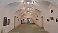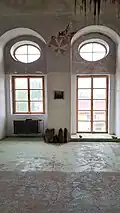 Hlavním portálem se vstupuje do široké haly s valenou klenbou se čtyřmi páry výsečí a s řadou středních polí. Výseče a pole jsou rámována štukovými hřebínky. Na halu navazuje čtvercová místnost o dvou klenebních osách obdobného řešení. Místnost s halou tvoří osu budovy, na kterou po stranách navazují menší obytné klenuté místnosti. V jihozápadní části budovy je klenuté schodiště, které vede do prvního patra. Dispozice patra je stejná jako v přízemí, místnosti mají plochý strop, některé trámový. Vnitřní vybavení je novodobé částečně novogotické a novorenesanční. Místnosti ve věžích jsou plochostropé.