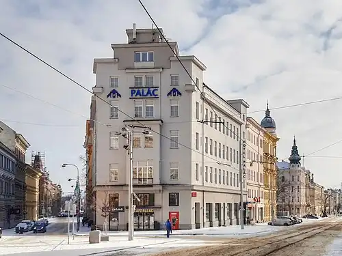 Původně neorenesanční bytová stavba na třídě 1. máje 27 (čp. 869) postavená roku 1882 Moritzem Fischerem podle projektu Karla Starého st. V přízemí si 23. ledna 1888 restauratér Nowak otevřel kavárnu Austria, poté byl dům přestavěn pro účely krátkodobého ubytování.[1] Hotel postupně střídal názvy od Grand Hotel Austria (1900) přes Hotel Slavia (1921) až po Hotel Palace (1939). V průběhu doby střídal majitele, např. v letech 1924 až 1927 jej měla v nájmu společnost YMCA. V letech 1927–1928 byl radikálně funkcionalisticky přestavěn podle návrhu architekta Huberta Austa.[1]