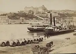 V roce 1846 dosáhla do Budapešti železnice. První trať do maďarské metrople vedla z území dnešního Slovenska ze Štúrova přes Vác.[13] První budapešťské nádraží se jmenovalo Pešťská odjezdová budova (maďarsky Pesti Indóház) a stálo v místě současného nádraží Nyugati pályaudvar. Výstavba loděnic na Dunaji odstartovala industrializaci města, která se odehrávala později, v druhé polovině 19. století. V hospodářství města nicméně začal dominovat potravinářský průmysl. Existovala rozsáhlá síť parních mlýnů. Jejich vznik inicioval rovněž Széchenyi, především Pešťská mlynářská společnost, která byla významným investorem a držitelem akcií řady dalších firem.[14] Otevření předlitavského trhu pro zalitavské farmáře znamenalo cestu k prospěritě; železnice umožnila spolu s paroplavbou po Dunaji vyvážet velké objemy potravin směrem na západ.