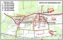 Sovětský předvoj zaútočil na Tannenbergovu linii a dobyl část Lastekodumägi, nejvýchodnější ze tří kopců. Následující dny se Sověti pokusili dobýt zbývající dva kopce, ale jejich pokusy selhaly. Dne 28. července 1944 následoval německý protiútok, který se však zhroutil pod náporem sovětských tankových pluků. Jednotky III. armádního sboru se zakopaly v nových pozicích u Grenaderimägi.[68][70]