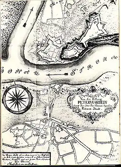 V závěru 18. století se město nachází na mapách tzv. prvního vojenského mapování Habsburské monarchie. Dobře je vidět tehdejší předmostí Petrovaradína s přiléhající vesnicí (Piska varoš), rozsáhlou bažinu (v prostoru, kde se dnes nachází Dunajský park) a dále souvislou městskou zástavbu v oblasti dnešního středu města. Petrovaradínskou pevnost Dunaj obtékal tehdy severněji než dnes (až za Petrovaradínským válečným ostrovem). Petrovaradín byl ještě součástí tzv. vojenské hranice.