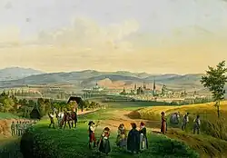 První polovina 19. století byla charakterizována poklidným měšťanským životem (biedermeier), v Olomouci vzhledem k neexistenci průmyslu žilo jen minimum dělníků a zdejší měšťané se již sžili s vojáky zdejší posádky (v letech 1829–1830 byl pevnostním velitelem hrabě Radecký), jichž bylo zhruba pět tisíc. Kromě nich ve městě žilo asi 10 tisíc obyvatel a na předměstích další tři tisíce.[47] V roce 1823 věnoval Ludwig van Beethoven svou právě dokončenou Missu solemnis olomouckému arcibiskupu Rudolfu Janovi. Roku 1830 bylo konečně postaveno stálé kamenné divadlo a o tři roky dříve bylo lyceum opět povýšeno na c. k. Františkovu univerzitu, ovšem stavovská akademie byla naopak v roce 1847 definitivně přemístěna do Brna, kde dala základ vysoké škole technické. Olomouci se nevyhýbal ani nástup moderní doby. Město leželo na křižovatce čtyř významných císařských silnic, pražské, brněnské, haličské a slezské, a dne 17. října 1841 byla do Olomouce z Přerova dovedena odbočka Severní dráhy a vybudováno městské nádraží. Následovala stavba železnice do Prahy a 20. srpna 1845 projel první slavnostní vlak na trase Vídeň – Olomouc – Praha.[48]