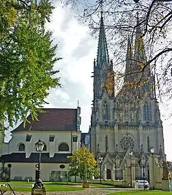 Olomoučtí Němci, z nichž řada nejdříve prošla internačním táborem v Hodolanech, byli poté vysídleni, čímž zcela zanikl tzv. olomoucký jazykový ostrov. Šlo celkem asi o 18 tisíc osob.[68] V roce 1946 byla obnovena Univerzita Palackého, jejíž fakulty se po jisté době ustálily na čtyřech: filosofické, přírodovědecké, lékařské a pedagogické. Po Únoru 1948 začaly tzv. akční výbory provádět „očistu veřejného života“, kromě politických odpůrců se nový režim v Olomouci zaměřil zvláště na římskokatolickou církev, byly rušeny kláštery, uzavřena teologická fakulta a nový arcibiskup Matocha byl fakticky internován.[69] V roce 1957 město navštívil Olomouc Nikita Sergejevič Chruščov i přesto, že Olomouc byla degradovaná z důležitého krajského města na okresní sídlo ve prospěch protežované hornické Ostravy.[70] Až v 60. letech došlo k uvolnění a rozvoji kultury, v Olomouci pro to byly výhodné podmínky, neboť kromě univerzity zde působila Moravská filharmonie, státní divadlo nesoucí jméno Oldřicha Stibora (se soubory činohry, opery, baletu a operety), oblastní galerie, vlastivědný ústav, státní vědecká knihovna, studio Československého rozhlasu a hvězdárna. Působilo zde také několik divadel tzv. malých forem, např. Studio LUT, Zápalka, RADIONKAbaret nebo SKUMAFKA. Významným se stal rok 1971, kdy byla v už celkem zanedbaném historickém jádru města vyhlášena městská památková rezervace, tehdy probíhající normalizace ovšem jinak znamenala značný kulturní i společenský útlum.[71] Z hlediska administrativního vývoje byla Olomouc v letech 1949–1960 centrem kraje, který byl ale poté zrušen a město už bylo jen sídlem okresu, který spadal do územně poměrně nesourodého Severomoravského kraje s centrem v Ostravě. V 70. letech ale proběhlo další rozšiřování města: v roce 1974 došlo k připojení Droždína, Holic, Chomoutova, Radíkova, Samotišek, Slavonína, Svatého Kopečku a Týnečku, v roce 1975 Břuchotína, Bystrovan, Křelova, Nedvězí, Nemilan a Topolan a nakonec roku 1980 Lošova (Bystrovany a Samotišky se ale v roce 1992 opět osamostatnily a roku 1994 také Břuchotín s Křelovem). Roku 1978 pak Olomouc, řízená městským národním výborem, poprvé přesáhla hranici 100 000 obyvatel.[72]