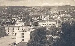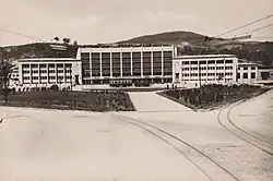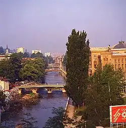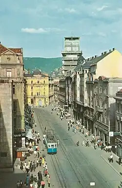 Ekonomické poměry meziválečné Jugoslávie nicméně neumožňovaly dynamičtější rozvoj města.[27][28] I přesto byla postavena řada moderních budov, které odrážely umělecké i architektonické tendence své doby. Jednalo se např. o sídlo Hypoteční banky, dnešní budovu Centrální banky Bosny a Hercegoviny, Vakufský mrakodrap (první reprezentativní výšková budova v centru města), nebo Vakufský dům, jehož architektem byl Čech Marián Pařík, syn Karla Paříka. Stavební rozvoj však probíhal zcela neorganizovaně; město nemělo vlastní územní plán v podobě, jakou disponovaly např. Záhřeb, nebo Bělehrad. Zatímco v Bělehradě byla diskutována budoucí podoba sítě ulic a modernistická vize metropole jugoslávského státu, v Sarajevu rostly nové budovy v historickém centru, namísto parků vznikaly nové domy v podstatě kdekoliv, kde se našlo volné místo. Teprve až v roce 1938 místní radnice zamýšlela, že vypíše na regulační plán, který by budoucnost města narýsoval, veřejnou soutěž.[29] Nic z toho se ale neuskutečnilo kvůli druhé světové válce.