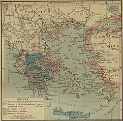 Řecko se skládalo z mnoha městských států, řecky polis,[41] z nichž nejdůležitější byly: Athény, Sparta, Korint a Théby. Z názvu polis pochází slovo politika (doslova znamená správa obce). Řecká města mezi sebou neměla mnoho kontaktů, protože ležela v horách nebo na ostrovech. Když město přestalo mít dostatek potravin, byli někteří občané vysláni, aby založili město nové – nazývalo se kolonie.