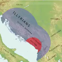 Ilýrie[35] se rozkládala na jihozápadě Balkánského poloostrova, její obyvatelé se jmenovali Ilyrové. Byli to předkové Albánců. Ilyrové žili v tribunech jako Epirus, Dardania, Taulantia atd. Měli svůj vlastní illyrský jazyk, který se lišil od řečtiny a latiny. K roku 1000 př. n. l. se počet obyvatel Illýrie odhaduje zhruba na 500 000.