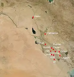 Sumerská říše byla první známá starověká civilizace.[36] Sumerové převzali region MezopotámieÚrodný půlměsíc asi v roce 3300 př. n. l. Do roku 3000 př. n. l. bylo v Sumeru vystaveno mnoho měst, geograficky oddělených od Mezopotámie. Byla tvořena nezávisle a každé mělo svou vlastní vládu. Šlo o městské státy, které mezi sebou často bojovaly.