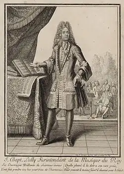 Italská opera se poměrně brzo dostala do Francie, ale delší dobu trvalo, než zde zakotvila. Přes přepychovou výpravu neměla představení např. Orfea Luigiho Rossiho (1647) nebo Zamilovaného Herkula Francesca Cavalliho (1662) úspěch, francouzskému vkusu odporoval zejména zpěv kastrátů.[39] Hlavním divadelním útvarem na dvoře Ludvíka XIV. byl tanec, formalizovaný v tzv. ballets de la cour. Až roku 1669 byla k pěstování operního divadla založena Académie royale de musique, jež zahájila provoz operou Roberta Camberta na libreto Pierra Perina Pomona (Pomone). Umělecký význam však získala nová instituce až po roce 1672, kdy se privilegium na vedení Akademie obdržel skladatel italského původu Jean-Baptiste Lully, který se již v předchozích letech proslavil spoluprací s Molièrem na žánru kombinujícím činohru s baletem a zpěvem, tzv. comédie-ballet (Měšťák šlechticem / Le Bourgeois gentilhomme, 1670). Lully ve svých operních dílech, napsaných ve spolupráci s významným básníkem a dramatikem Philippem Quinaultem, kladl důraz na francouzský recitativ, rytmicky bohatší než recitativ italský a sledující příznačné rysy francouzské činoherní deklamace. Recitativ je často je doprovázen plným orchestrem a kontrast mezi ním a árií je menší než u italských děl. Pro Lullyho jsou také typické tzv. choeurs, tedy sborové zpěvy, které se střídají napříč celou operou s áriemi (nejznámější je nejspíše Choeur des trembleurs z opery Isis). Charakteristická pro Lullyho opery je rovněž hojná účast baletu a z baletní praxe také pochází dvoudílná tzv. francouzská předehra. Pro odlišení od italské opery Lully pro svá díla používal pojem „tragédie lyrique“ (neboli tragédie en musique), který jako označení francouzské vážné opery přetrval až do 19. století. První z nich byla Kadmos a Hermiona (Cadmus et Hemione, 1673), následovaly Alcesta aneb triumf Alcidy (Alceste ou le Triomphe d'Alcide, 1674), Théseus (Thésée, 1675), Atys (1676), Isis, díky které byl libretista Quinault na dva roky vyloučen z dvorské společnosti (1677)Perseus (Persée, 1682), Faethón (Phaëton, 1683), Amadis (1684) a Armida (Armide, 1686).[40]