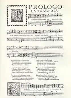 Opera v moderním smyslu se zrodila ve společnosti intelektuálů zvané florentská camerata, která se v poslední čtvrtině 16. století scházela ve Florencii nejprve pod patronací hraběte Giovanniho Bardiho a po jeho odchodu do Říma roku 1592 pod záštitou hraběte Jacopa Corsiho.[13] Zpěvák a skladatel Vincenzo Galilei pod vlivem svého učitele Girolama Meiho napsal dílo Dialogo della musica antica e moderna (1581), v němž účinnost antického dramatu (u nějž předpokládal plné zhudebnění) přičítal jednohlasému zpěvu i doprovodu. Skladatelé z okruhu cameraty Jacopo Peri a Giulio Caccini a básník Ottavio Rinuccini poté prakticky ve svých dílech i teoreticky rozvinuli tyto zásady na podkladě idey obrození antického dramatu. Vytýkali polyfonickému zpěvu nesrozumitelnost slov (laceramente della poesia, roztrhání poezie) a neschopnost vyjádřit bezprostřední emoce. V novém dramatickém žánru by měl být veškerý text zpíván sólisty nebo sborem monodicky, ačkoli případně vícehlasně, za doprovodu malého souboru tišších nástrojů harmonicky doprovázejících zpívané slovo. Hudba měla přesně vyjadřovat text a jeho citový význam beze všech pěveckých ozdob.[14] Emilio de' Cavalieri vyjádřil ideál interpretace rané opery slovy „recitar cantando“, přednášet zpívaje.[15]