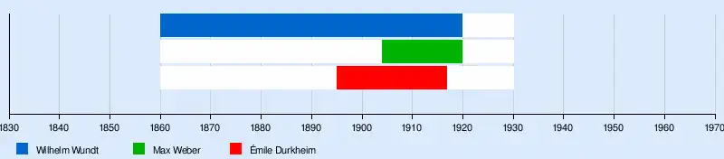 Mezi nejvýznamnější osobnosti přelomu 19. a 20. století patří německý psycholog a zakladatel vědecké psychologie Wilhelm Wundt. Wundt byl uznávaným univerzitním profesorem.[33] Původně se věnoval fyziologii, postupně ale zaměřil svoji pozornost především na psychologii a svými úvahami značně přispěl a ovlivnil sociologii.[33] V rámci ní se inspiroval anglickým sociologem Herbertem Spencerem a jeho teoriemi. Stejně jako Spencer i Wundt se věnoval pojmu příčinnosti dějů. Wundt se též věnoval zkoumání vazeb mezi psychologickými a sociálními ději.[34] Nakonec konstatoval, že mezi nimi neexistuje vztah jednosměrné příčinnosti. To znamená, že jeden psychologický děj nemůže způsobit děj sociální a naopak.[34]