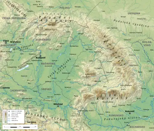 Řeky: (a) Visla, (b) Dunaj, (c) Tisa, (d) Sáva, (e) Dněstr, (f) Prut.