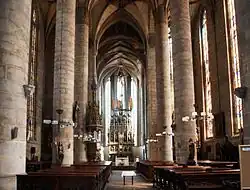 Ve vícelodní gotické architektuře jsou lodi od sebe odděleny hladkou stěnou, prolomenou dole lomenými oblouky s pilíři. Mezi oblouky mohou být polosloupy, často bohatě profilované či tvořené svazky prutů, z nichž nahoře pomocí přípor vybíhají žebra hlavní klenby. Podobně je tomu i u jednolodních gotických staveb. Teprve v pozdně gotické halové či stejnolodní architektuře se opět objevují volně stojící kamenné sloupy, často různě profilované, osmiboké a podobně, z nichž nahoře vybíhají žebra, často oddělená pouze konzolami.