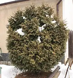 - Thuja occidentalis 'Umbraculifera' — nižší zakrslá forma, vysoká do 1,5 m, s tenkými modravými větévkami.