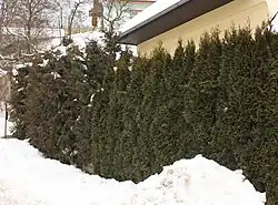- Thuja occidentalis 'Malonyana' — velmi úzce sloupovitá, sytě zelená barva, používaná na živé ploty, není příliš vhodná, nemusí se téměř tvarovat.[2]