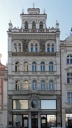 Na domě jsou ve třetím patře sgrafita od Mikoláše Alše zpodobňující dva rytíře na koni s prapory (realizoval Jindřich Duchoslav Krajíček), která jsou chráněna jako kulturní památka České republiky.[1]