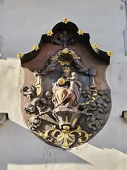 - Štukový reliéf trůnící Panny Marie královny s dítětem, z trůnu raší ratolesti růžového keře; stylově pozdně barokní dílo z 2. poloviny 18. století (?).