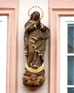 Na zdobném kamenném podstavci s hlavou anděla s pozlacenými křídly umístěném na fasádě domu se nachází impozantní barokní socha Panny Marie Neposkvrněné čili Immaculaty. Socha je vytesána z pískovce a pochází nejspíše z poloviny 18. století. Ikonografický motiv Immaculaty vychází z interpretace novozákonního Zjevení Janova, v němž se píše o „ženě sluncem oděné“, což bylo vztaženo právě na Pannu Marii. Dogma o neposkvrněném početí Panny Marie, na jehož základě je Matka Boží prosta tzv. dědičného hříchu, se sice prosadilo až mnohem později, ovšem již od středověku bylo propagováno například františkánským řádem. S tím souvisí i četnost užívání tohoto motivu v Kadani, město bylo totiž od středověku významnou františkánskou lokalitou (Františkánský klášter, Minoritský klášter). V 17. století se Panna Marie Neposkvrněná stala v českých zemích jedním ze symbolů tzv. katolické protireformace.