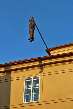 Na střeše domu, směrem do Husovy ulice je instalována socha Viselec (označovaná jako Zavěšený muž, nebo jako socha Sigmunda Freuda) od umělce Davida Černého.