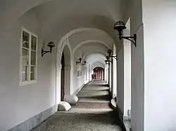 Z průjezdu do obdélného dvora vede vlevo dvouramenné, dřevěné, raně barokní schodiště. Dvorní průčelí jsou jednoduchá, podél západního dvorního křídla je krátká pavlač s oplechovaným zábradlím.[5]