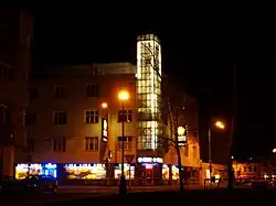 Tato pozoruhodná realizace obytného a obchodního domu zvaného „U skleněné věže“, který pro obchodníka a výběrčího obecní dávky z lihovin Karla Vlčka navrhl místní funkcionalistický projektant Josef Fňouk, pochází z roku 1929[3]. Zde je třeba zmínit, že zatímco po celém okolí řádila 4. července 1929 velká vichřice, jež za sebou nechávala ohromnou spoušť, měla Vlčkova novostavba velké štěstí, protože lešení u domu zůstalo neporušeno[4] a také na samotném objektu nevznikla žádná škoda. V roce 1933 byl dům přestavěn do dnešní podoby podle architekta Václava Placáka. O 3 roky později obdržel Karel Vlček povolení k používání nově zřízených dílen.