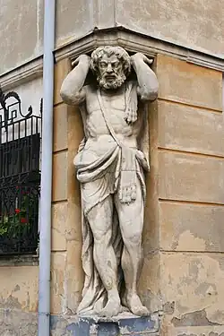 Na budově poutá pozornost monumentální kamenná socha Atlanta, nesoucího roh prvního patra. Autorem sochy je Vavřinec Dunajský, socha byla vyhotovena v roce 1820. Socha je známá pod lidovým označením Corgoň. Toto jméno z prostředí nitranského folklóru je spojeno s legendární postavou nitranského kováře, který byl pro svou obrovskou sílu postrachem Turků. Legenda říká, že svými mocnýma rukama házel velké balvany přímo na řítící se Turky.