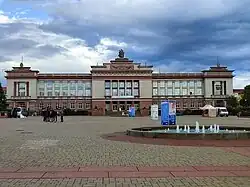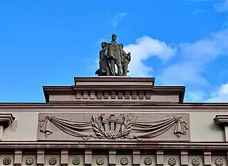 Nad průčelím: Sousoší tří postav v nadživotní velikosti, k jehož vytvoření byl přinucen akademický sochař Jaroslav Šlezinger, vězněný ve Vykmanově.[2][3]