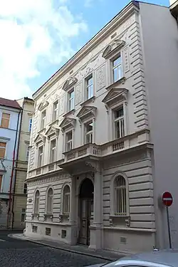 Návrh nárožního třípatrového činžovního domu je ovlivněný pozdní renesancí. Dům postavil v roce 1876 Antonín Wiehl s Janem Zeyerem. Fasádu zdobí portál a balkon. V roce 1905 byl dům upravován a na skosené nároží přistavěn arkýř a poslední patro dodatečně dozdobeno plastickým ornamentem.[1]