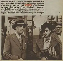 - ↑ Pandit Nehru přijel do Prahy. Večer. 1938-08-10, s. 2. Dostupné online po registraci. Dostupné online. ISSN 1804-8838.